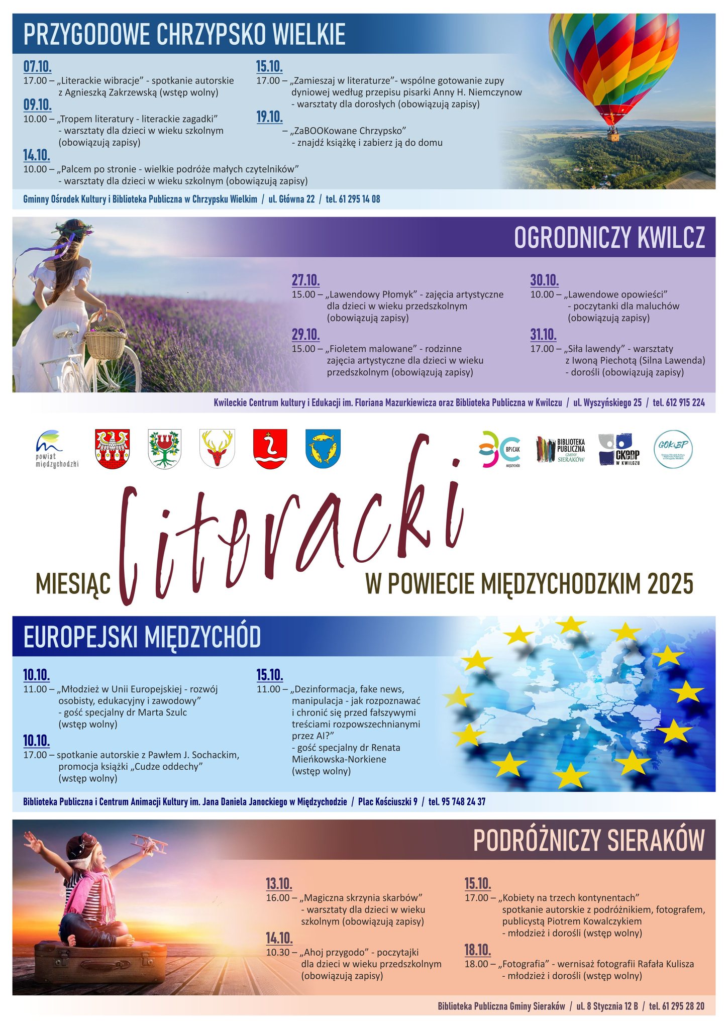 „Podróżniczy Sieraków” zaprasza młodzież i dorosłych na niesamowite spotkanie z podróżnikiem Piotrem Kowalczykiem, proponuje piękno w czystej postaci czyli wernisaż fotografii Rafała Kulisza, a najmłodszym czytelnikom oferuje czytanie na głos i warsztaty literackie. To wielka przygoda przez kontynenty, zachęcająca do odkrywania świata i siebie.